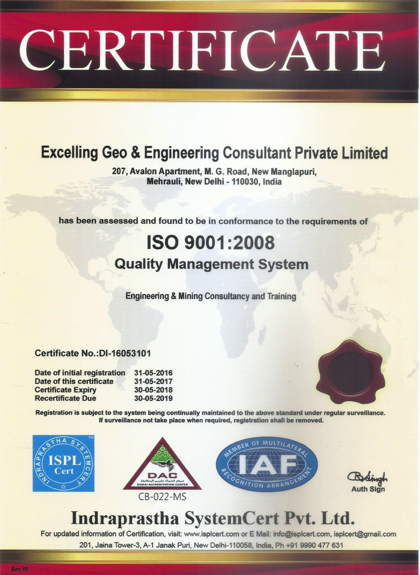 Excelling Geo & Engineering Consultant Private Limited is always committed for quality services with competitive coast and time. We conduct training to improve our services on the basis of projects and assessment of work time to time. We are ISO 9001:2008 certified company and achieve, sustain and enhance client’s satisfaction by continually improving the effectiveness of quality management system through dedicated Teamwork.